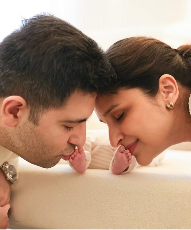 उन्होंने दो तस्वीरें शेयर की हैं. पहली तस्वीर में परिणीति और राघव बेटे के पैर को किस करते नज़र आ रहे हैं और दूसरी तस्वीर में दोनों ने बेटे के पैर को थाम रखा है.