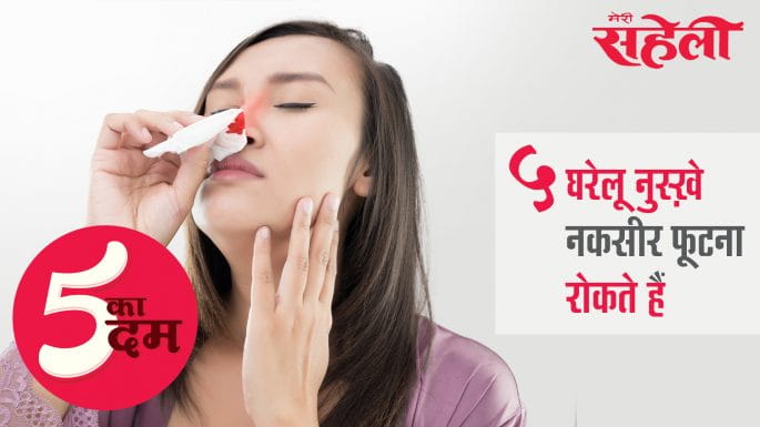 नकसीर फूटना रोकने के अन्य घरेलू उपचार: * नकसीर फूटने पर सबसे पहले रोगी को तुरन्त ठंडे स्थान पर ले जाना चाहिए. पैर से जूते-मोजे उतार देने चाहिए, ताकि शरीर की गर्मी तलुवों द्वारा बाहर निकल सके. * नकसीर फूटने पर तुरंत बैठ जाएं और आगे की तरफ झुक जाएं. सिर ऊंचा न करें, ऐसा करने से खून फिर से नाक में जा सकता है. * नाक पर रूमाल या टिशू पेपर रखें, ताकि वो खून को सोख ले. * अंगूठे और तर्जनी उंगलियोंं की मदद से नाक की जड़ को थोडी देर तक दबाए रखें, ताकि खून का प्रवाह रुक जाए. * सामान्य उपचार के आधे घंटे बाद भी यदि नाक से खून का बहना न रुके, तो डॉक्टर से संपर्क करें.यह भी पढ़ें: 5 चमत्कारी घरेलू गर्भनिरोधक रोकते हैं गर्भधारण (5 Best Home Remedies To Avoid Pregnancy)