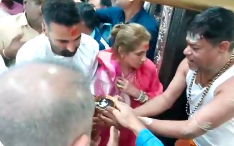 मंदिर विजिट के दौरान अक्षय व्हाइट-कुर्ता पायजामा पहने हुए बेहद सिम्पल लुक में नजर आए. पूजा-अर्चना और दर्शन के बाद अक्षय माथे में तिलक और गले में फूलों की माला पहने हुए दिखाई दिए.