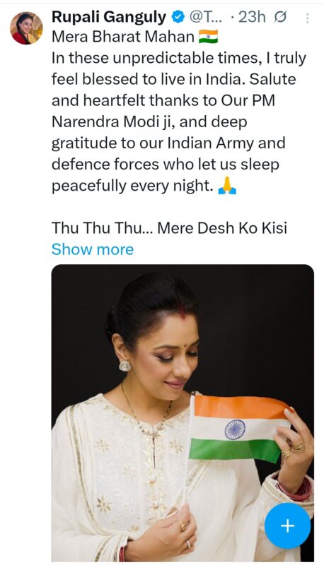 अनुपमा फेम रुपाली गांगुली पीएम मोदी की जबरदस्त फैंस हैं. अक्सर मोदी जी तारीफ में अपने राय रखती हैं. इस बार भी रुपाली गांगुली ने पीएम मोदी द्वारा किए गए विकास कार्यों और योजनाओं पर अपनी राय रखी है. एक्ट्रेस ने एक्स पर एक पोस्ट शेयर करते हुए देश की सुरक्षा और तरक्की के लिए पीएम मोदी और भारतीय सेना का आभार जताया है. ये भी लिखा है कि वे भारत में रहने के लिए खुद को सौभाग्यशाली मानती हैं. दुनियाभर में फैले ऐसे अनिश्चित माहौल की अपेक्षा ऐसे में भारत में रहना गर्व की बात है