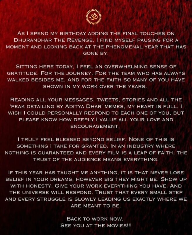 आदित्य धर ने आगे लिखा, "आज यहां बैठकर बेहद शुक्रगुजार फील कर रहा हूं इस जर्नी के लिए, उस टीम के लिए जो हमेशा मेरे साथ खड़ी रही, और आप लोगों में से इतने सारे लोगों ने सालों से मेरे काम पर जो भरोसा दिखाया है, उसके लिए. आप सभी के मैसेज, ट्वीट, स्टोरीज और 'पीक डिटेलिंग बाय आदित्य धर' वाले मीम्स पढ़कर मेरा दिल भर आया. काश मैं आप लोगों को पर्सनली जवाब दे पाता, लेकिन प्लीज यकीन मानें कि मैं आपके प्यार और हौसले की बहुत ज्यादा कद्र करता हूं."