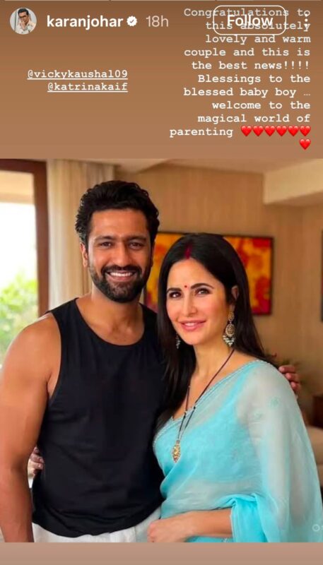 फिल्म मेकर करण जौहर ने अपनी इंस्टाग्राम स्टोरीज पर विक्की और कैटरीना की एक खूबसूरत तस्वीर शेयर की. इस तस्वीर के साथ करण ने बेटे के जन्म पर बधाई देते हुए लिखा है- इंडस्ट्री के बेहद प्यारे और वॉर्म कपल को बेबी बॉय के होने की बहुत-बहुत बधाई. ये सबसे अच्छी खबर है. आशीर्वाद उस ब्लेस्ड बेटे को… पेरेंटिंग के मैजिकल वर्ल्ड में आप दोनों का वेलकम है.