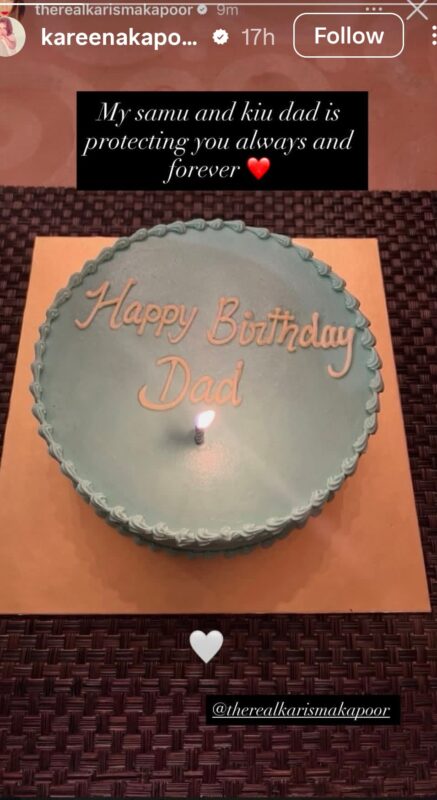 आज दिवंगत बिजनेस टायकून संजय कपूर का बर्थडे भी है. करिश्मा कपूर के बच्चों ने अपने दिवंगत पिता का सेलिब्रेट किया है. जिसकी फोटो करीना कपूर ने अपने इंस्टा स्टोरी में शेयर की है.करीना कपूर ने अपनी इंस्टा स्टोरी एक केक की फोटो शेयर की है जिसमें लिखा है - हैप्पी बर्थडे डैड.