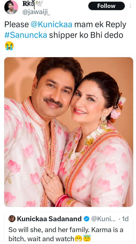 कुनिका ने एक्स पर एक पोस्ट शेयर करते हुए लिखा - शर्म करो. वो आदमी शादीशुदा है, उनके बच्चे हैं. ऐसे में इस तरह की तस्वीरें शेयर करना बेहद गैर-जिम्मेदाराना है. उन्होंने इसे “फैंडम वॉर” का हिस्सा बताते हुए कड़ी आलोचना की.