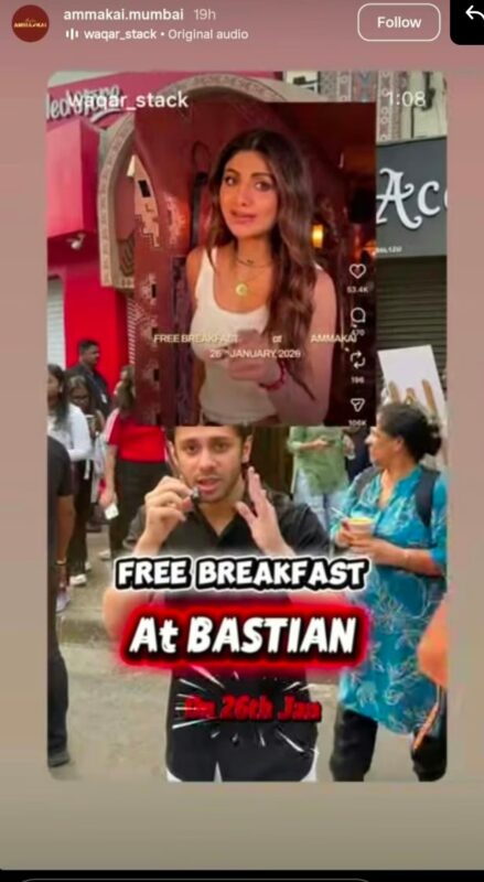 शिल्पा शेट्टी का हाल ही खुला नया रेस्टोरेंट अम्माकाई उस वक्त लोगों के बीच सेंटर ऑफ अट्रेक्शन। बन गया, जब एक्ट्रेस ने 26 जनवरी के मौके पर फ्री ब्रेकफास्ट का ऑफर निकाला था. हजारों लोग रेस्टोरेंट के बाहर कई घंटों तक इंतजार करते नजर आए. कई कंटेंट क्रिएटर्स ने सोशल मीडिया में इन लंबी कतारों की क्लिप शेयर की. जिसमें लोगों को फ्री खाने के 1 प्लेट के लिए धैर्यपूर्वक खड़े देखा गया है.