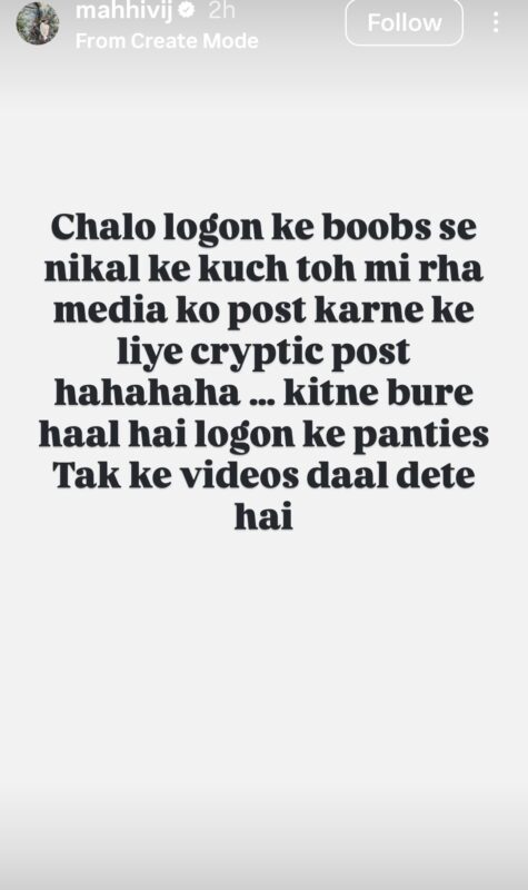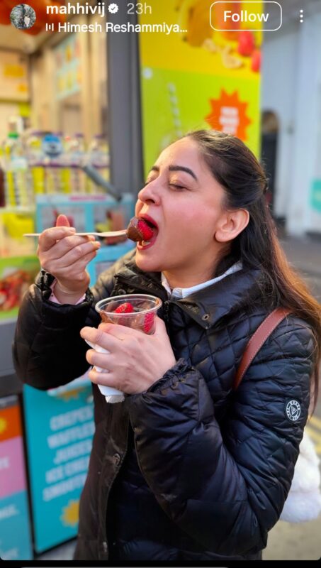 माही द्वारा शेयर की गई लेटेस्ट पोस्ट में एक्ट्रेस मस्ती भरे अंदाज में दिखाई दे रही हैं, बाकी की कुछ पोस्ट में माही ने कुछ कोट शेयर किए हैं. एक्ट्रेस का ये पोस्ट सोशल मीडिया पर जमकर वायरल हो रहा है. माही विज ने अपनी इंस्टा स्टोरी पर एक फोटो लगाई है, जिसमें एक्ट्रेस मस्त होकर चाकलेट वाली स्ट्रॉबेरी खाती हुई नजर आ रही है. इस तस्वीर के बैकराउंड में एक गाना चल रहा है- 'आईस्क्रीम खाऊंगी कश्मीर जाऊंगी...'