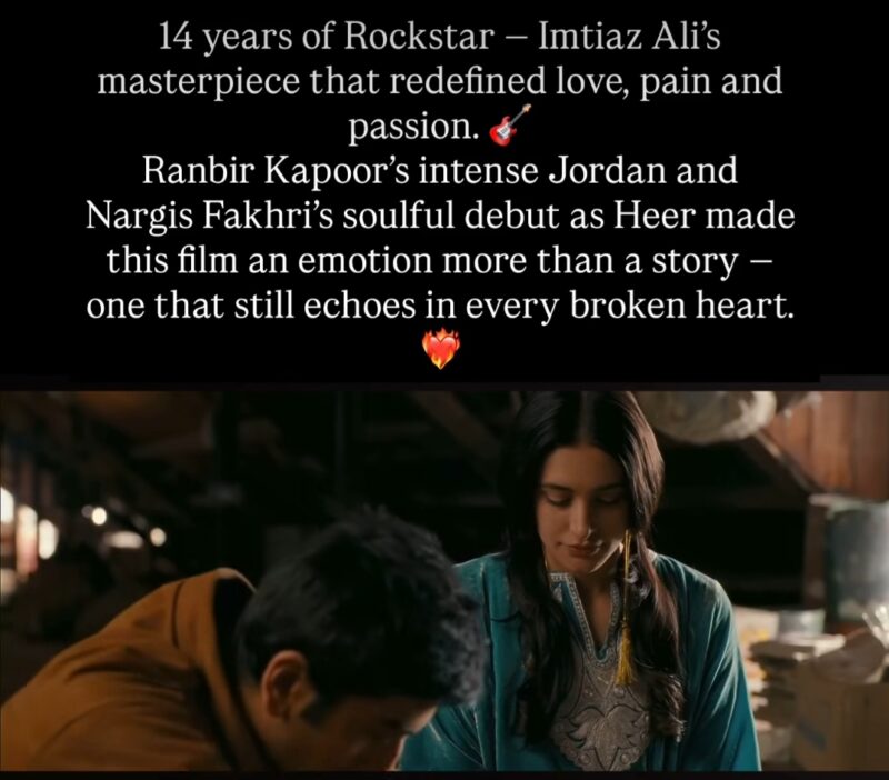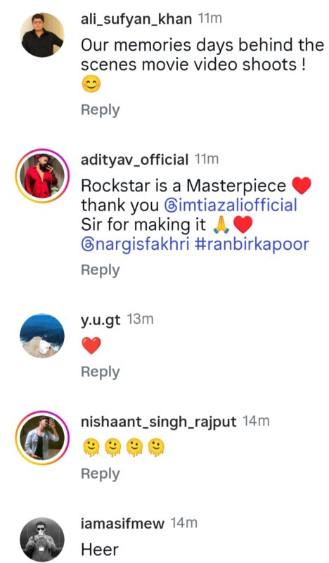 इसी के साथ उन्होंने चांद-तारे की इमोजी देते हुए रॉकस्टार, हीर, जॉर्डन (रणबीर कपूर जो फिल्म में जनार्दन जाखड़ की भूमिका में थे, जो बाद में रॉकस्टार जॉर्डन बन जाते हैं), 14 साल रॉकस्टार, प्यार और 111111 नंबरों को टैग किया.
