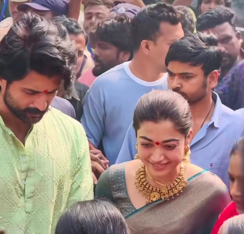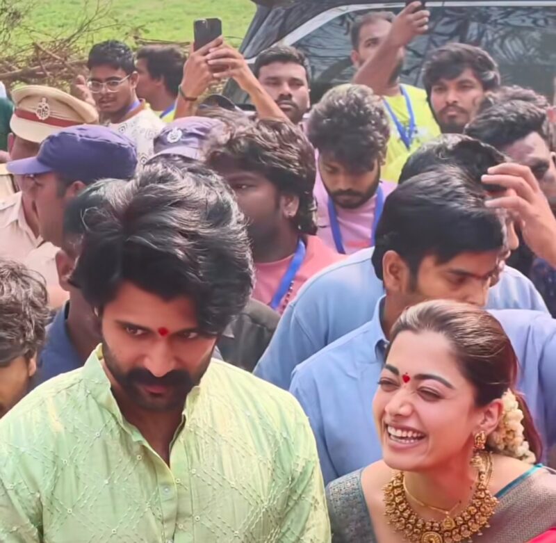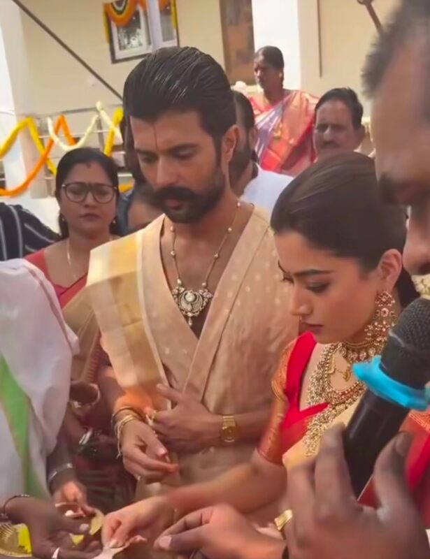 इस दौरान नई नवेली दुल्हन रश्मिका ग्रे कलर की साड़ी और गोल्ड ज्वेलरी पहने हुए बहुत सुंदर लग रही थीं. जबकि विजय ग्रीन कुर्ता और व्हाइट पायजामा पहने हुए सिंपल लुक में नजर आए.