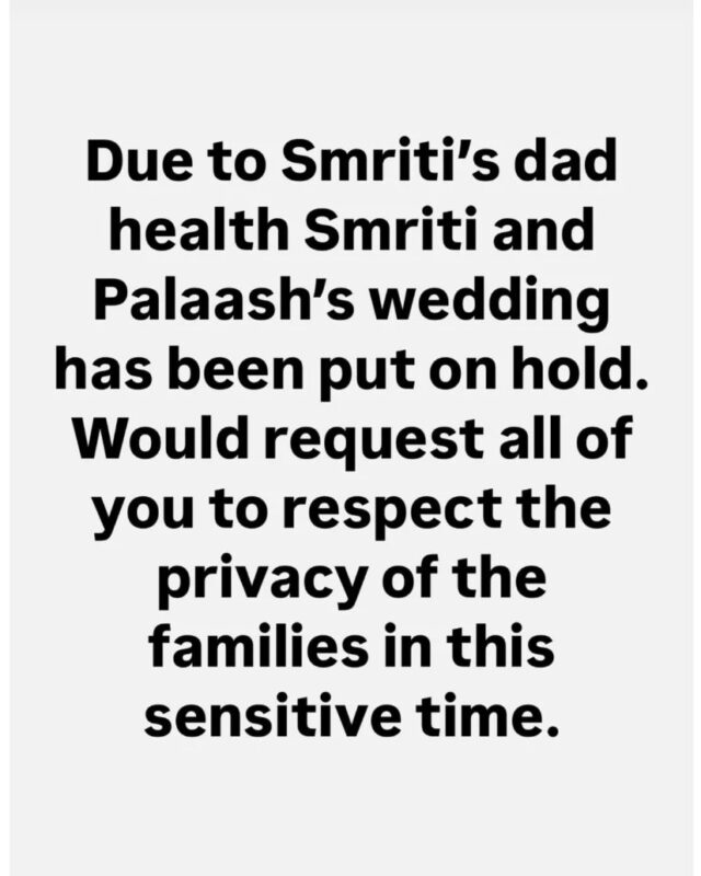 संगीत सेरेमनी के दौरान स्मृति के पिता श्रीनिवास मंधाना को हार्ट अटैक की शिकायत हुई उन्हें अस्पताल ले जाया गया और इलाज शुरू किया गया. पलाश की बहन-बॉलीवुड सिंगर पलक मुच्छल और स्मृति के मैनेजर तुहिन मिश्रा ने मीडिया को ये बताया कि जब तक स्मृति के पिता पूरी तरह से ठीक नहीं हो जाते, तब तक शादी को अनिश्चितकाल के लिए स्थगित कर गया है.