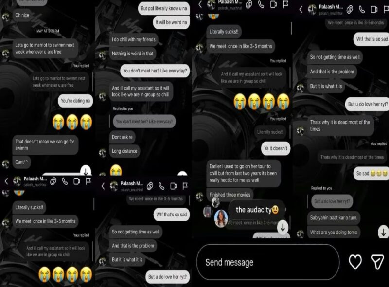 दरअसल मैरी डी’कोस्टा नाम की एक महिला ने अपनी इंस्टाग्राम स्टोरी पर पलाश के साथ हुई फ्लर्टिंग चैट के स्क्रीन शॉट्स शेयर किए. इस फ्लर्टिंग चैट में पलाश उस महिला से स्मृति के साथ ‘लॉन्ग डिस्टेंस’ रिलेशनशिप और उनके ‘टूर्स’ के बारे में खुलकर बात करते दिखे. पलाश ने मैरी की तारीफों के पुल बांधे, उन्हें स्विमिंग, स्पा और मुंबई के वर्सोवा बीच पर सुबह 5 बजे मिलने का कहा. जब मैरी ने पूछा पलाश से ये पूछा कि क्या वे स्मृति से प्यार करते हैं, तो पलाश ने जवाब टालने वाले व्यवहार में रिप्लाई किया.