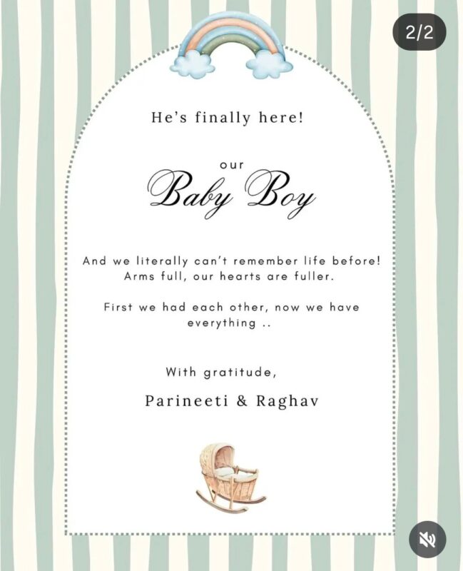 परिणीति चोपड़ा और राघव चड्ढा के घर खुशियों ने दस्तक दे दी है. कपल ने सोशल मीडिया पर एक पोस्ट शेयर अपनी खुशियों को फैंस के साथ शेयर किया है कि परिणीति चोपड़ा ने बेबी ब्वॉय को जन्म दिया है. इस गुड न्यूज के वायरल होते ही फैंस और उनके करीबी दोस्त कपल को पैरेंट्स बनने की शुभकामनाएं दे रहे हैं.