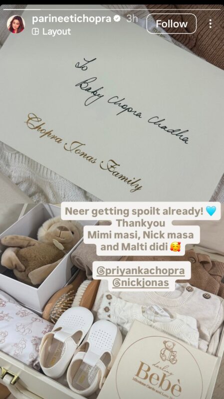 शेयर किए गए स्पेशल गिफ्ट की इस तस्वीर में मौसी प्रियंका ने अपने भांजे नीर के कपड़े, जूते और एक प्यारा सा टेडी भेजा है. गिफ्ट के साथ प्रियंका ने एक नोट भी लिखा. एक्ट्रेस ने लिखा, ‘टू बेबी चोपड़ा चड्ढा.. उसके नीचे चोपड़ा जोनस फैमिली लिखा है..’ परी ने इस फोटो को शेयर करते हुए लिखा, ‘ नीर बिगड़ रहा है..थैक्यू मिनि मौसी, निक मौसा और मालती दीदी...’