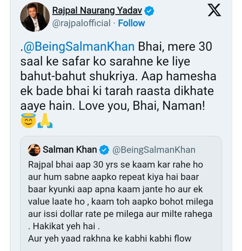 राजपाल ने एक्स पर लिखा- सलमान भाई मेरे 30 साल के सफर को सराहने के लिए बहुत-बहुत शुक्रिया. आप हमेशा एक बड़े भाई की तरह रास्ता दिखाते आए हैं. लव यू भाई नमन’. इस पोस्ट पर फैंस ने भी रिएक्ट करते हुए सलमान खान की दरियादिली की तारीफ की है.