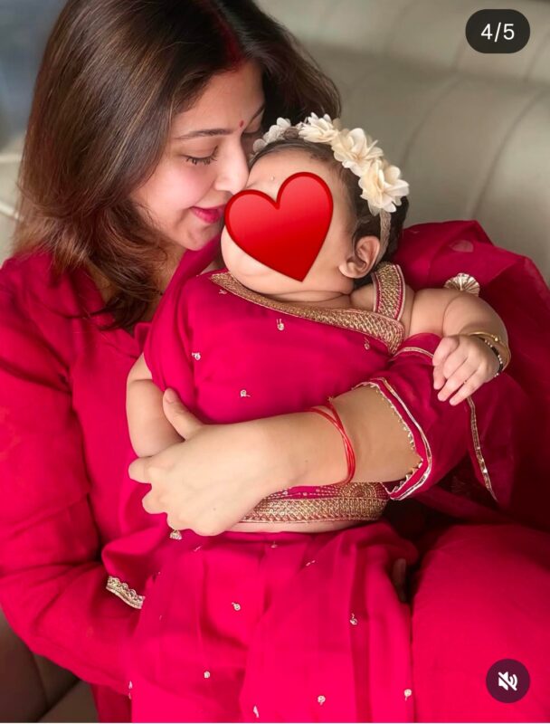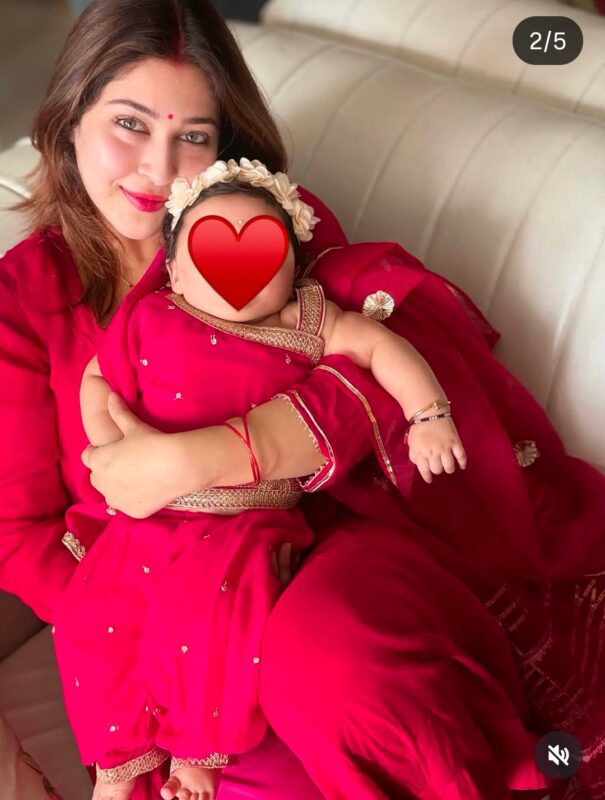 इन तस्वीरों में सोनारिका ने बेटी का फेस रिवील नहीं किया है. एक फोटो में विरिका पेट के बल लेटी हुई है और मुड़कर इधर-उधर देख रही है. दूसरी फोटो में विरिका अपनी मम्मी सोनारिका की गोद में नजर आ रही हैं. एक्ट्रेस ने फोटो में बेटी के फेस को छिपा रखा है, उसकी जगह हार्टशेप वाला इमोजी लगा रखा है.