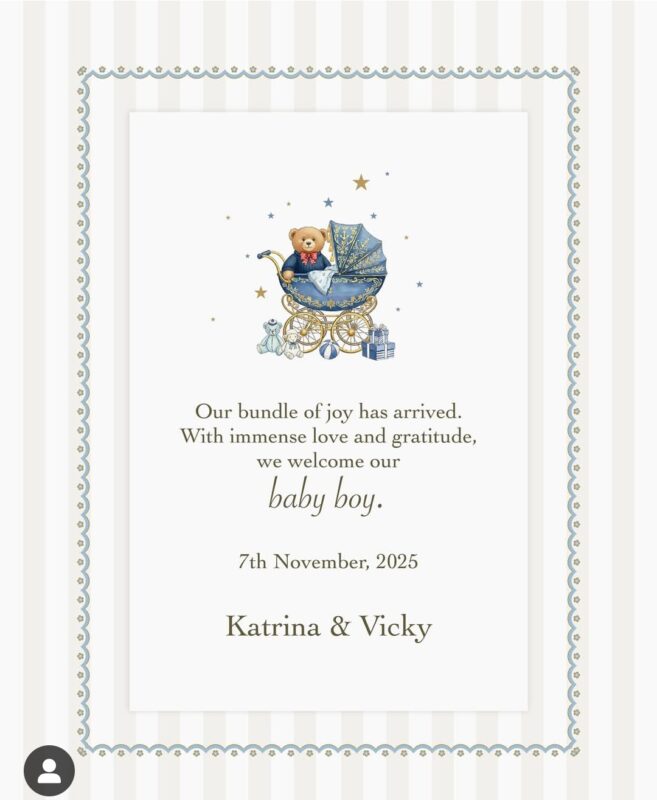 विक्की कौशल और कैटरीना कैफ ने अपने ज्वाइंट स्टेटमेंट की पोस्ट में लिखा है - हमारी खुशियों का बंडल आ गया है. बहुत कृतज्ञता के साथ, हम अपने बेबी बॉय का वेलकम करते हैं. 7 नवंबर, 2025 - कैटरीना और विक्की.